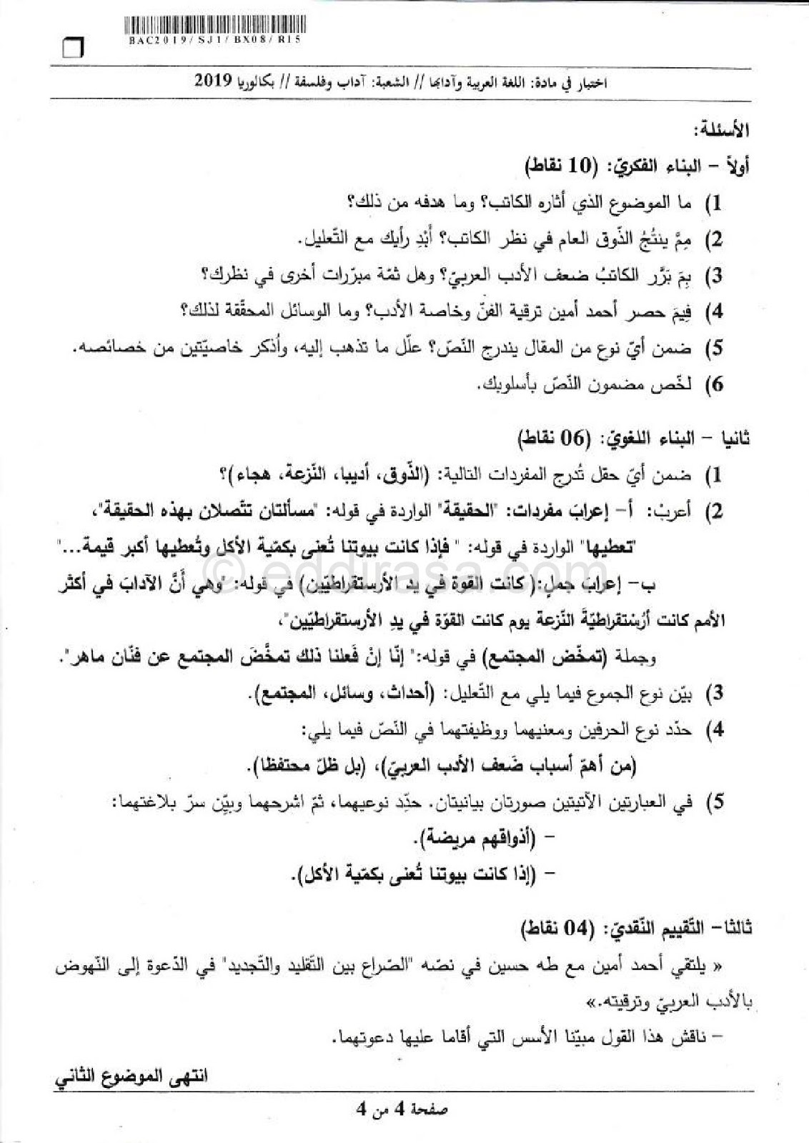 موضوع اللغة العربية بكالوريا 2019 آداب و فلسفة Bac 2019