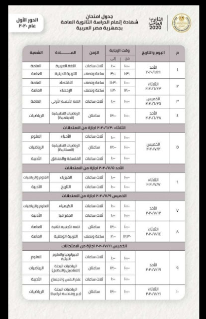 جدول امتحانات الثانوية العامة 2020 وزارة التربية والتعليم صباح مصر