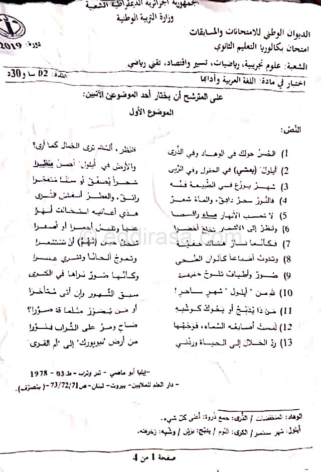 موضوع اللغة العربية بكالوريا 2019 شعبة تقني رياضي