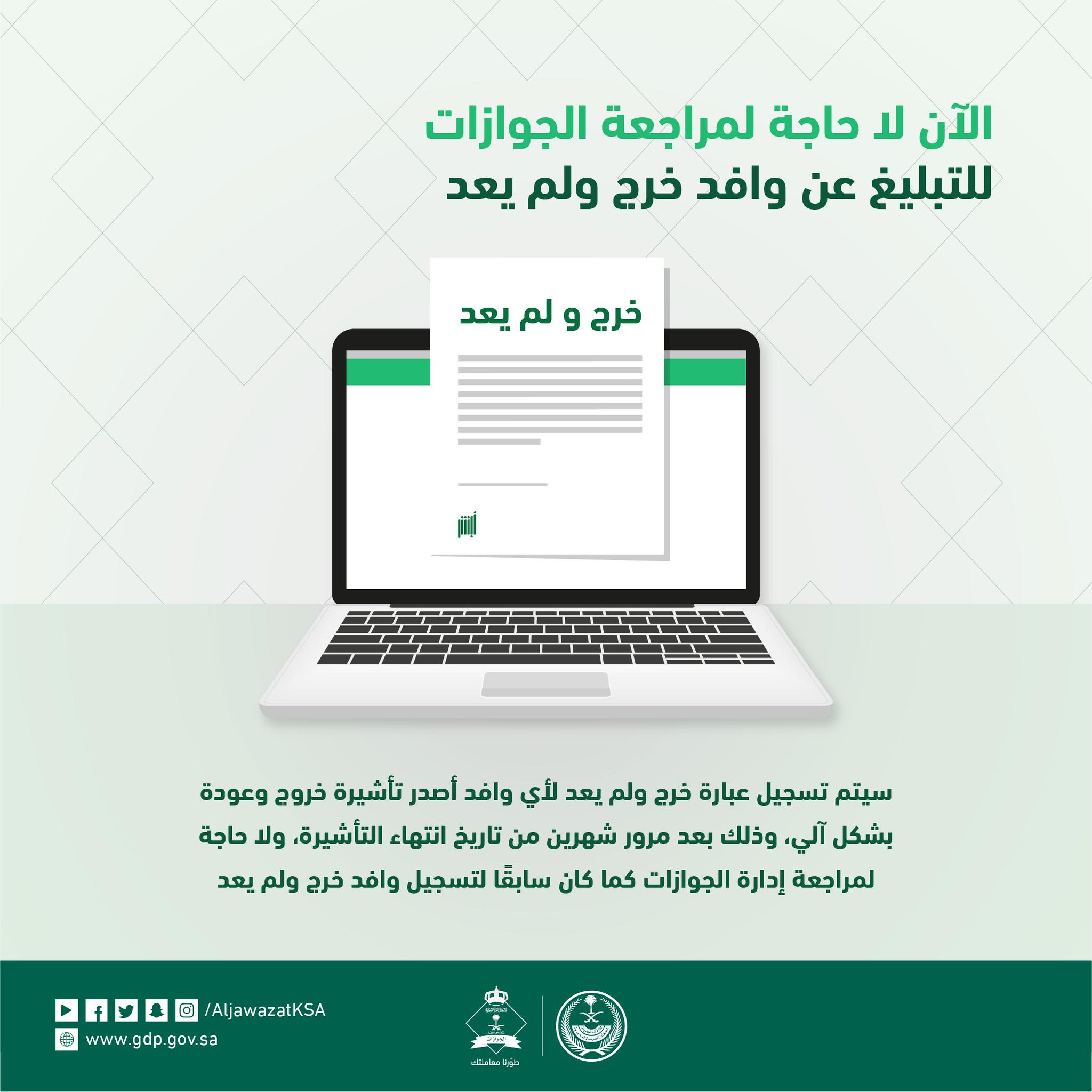 الجوازات السعودية On Twitter اهلا بك عزيزنا تسجيل خرج ولم يعد آلي ا وذلك بعد مرور شهرين من تاريخ انتهاء تأشيرة الخروج والعودة للوافد دون الحاجة لمراجعة الجوازات شكر التواصلك Https T Co Iqr8fydoio